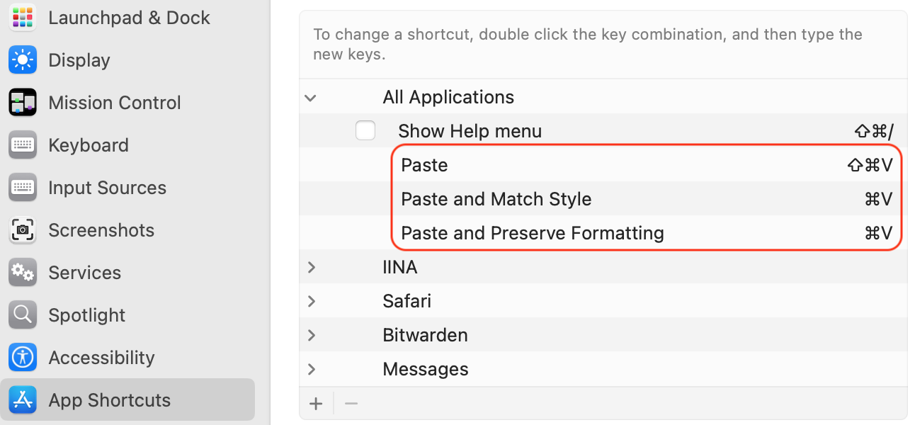 Note: Some applications are not compliant with this menu title convention, even Apple ones. For example, Xcode (currently 14.3.1) is weird. It has menu Edit → Paste with unique titles: Paste, Paste Special and Paste and Preserve Formatting. If you use an app like that you will need to check how it is called in the menu and create another shortcut with that title.
