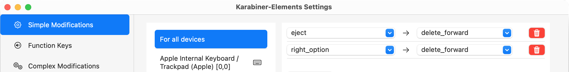 Personally, I am frequently deleting text after using the arrow keys to position and adjust the cursor. The hand is on the arrow keys and the right side option is already right there. So with a "Simple Modifications" menu I changed that to "forward_delete" just like the "Eject" button covered previously. Or: a [Newer post about the Eject button assignments].