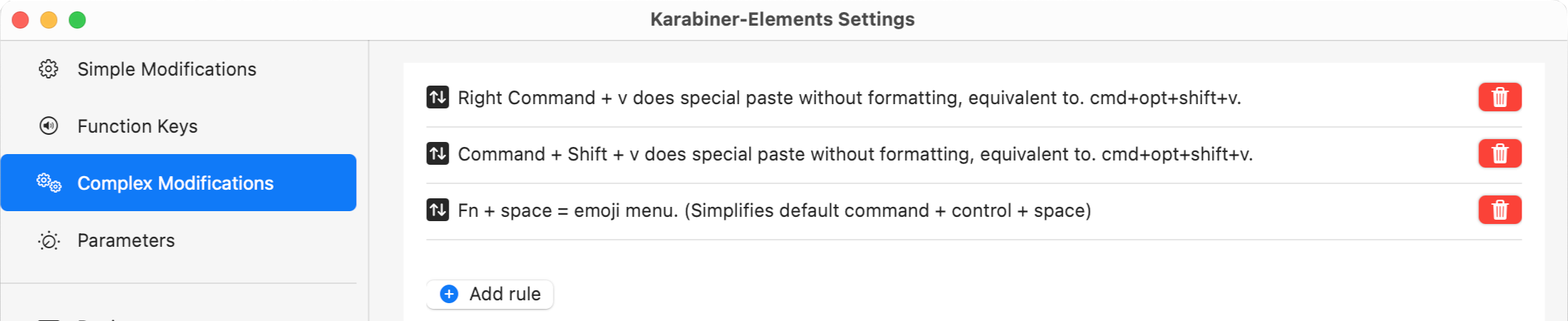 Search for “Right Command + v to paste without formatting” with expanded description Right Command + v does special paste without formatting, equivalent to. cmd+opt+shift+v. Click the blue "Import" button on the right to add it to your Karabiner application.
