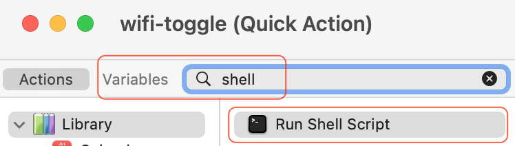There’s a loooong list of things we can start with. Just search for and select Run Shell Script. Drag the Run Shell Script into the main space on the right of the screen.