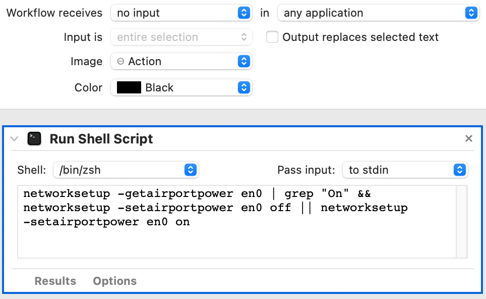 Goal: have a simple shortcut if I want to turn WiFi on or off. Shows how it’s done with Automator and a script.