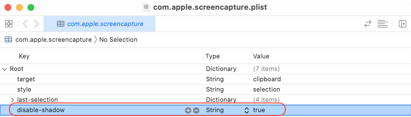 plutil -convert xml1. That whole command is covered in a previous post. In this case I see that the shadow is disabled and the target is set to my ~/Desktop/: